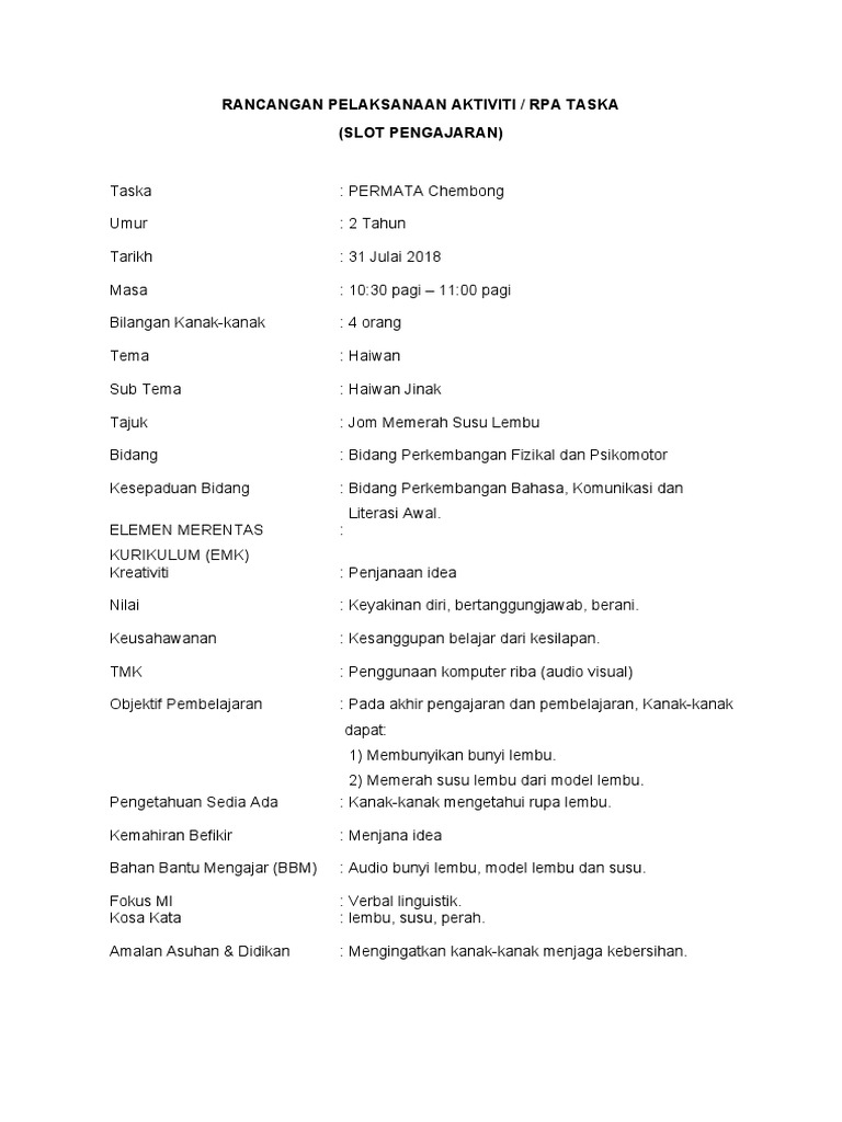 Rancangan Pengajaran Aktiviti Rpa Taska